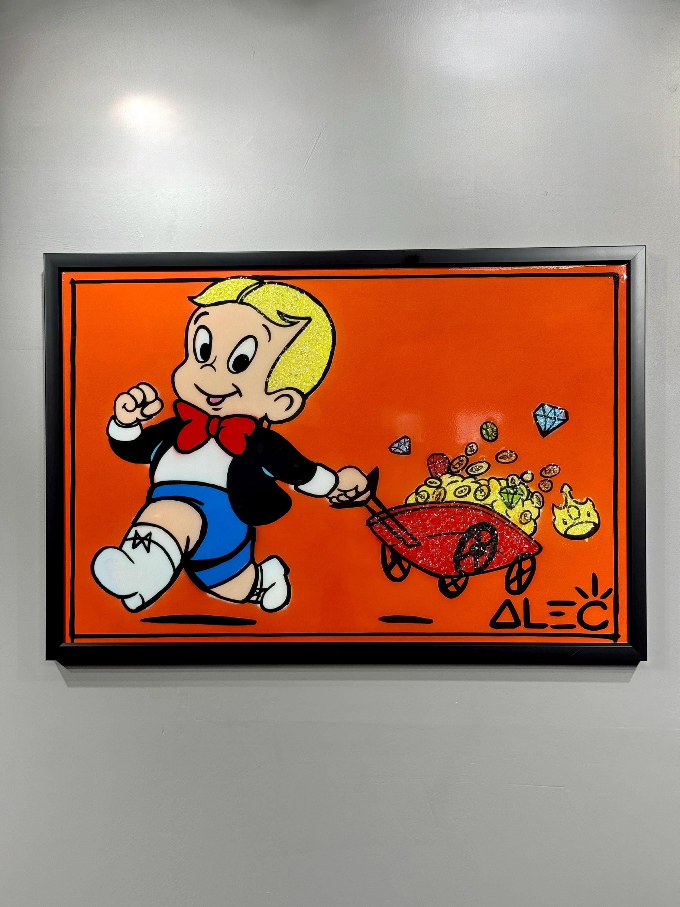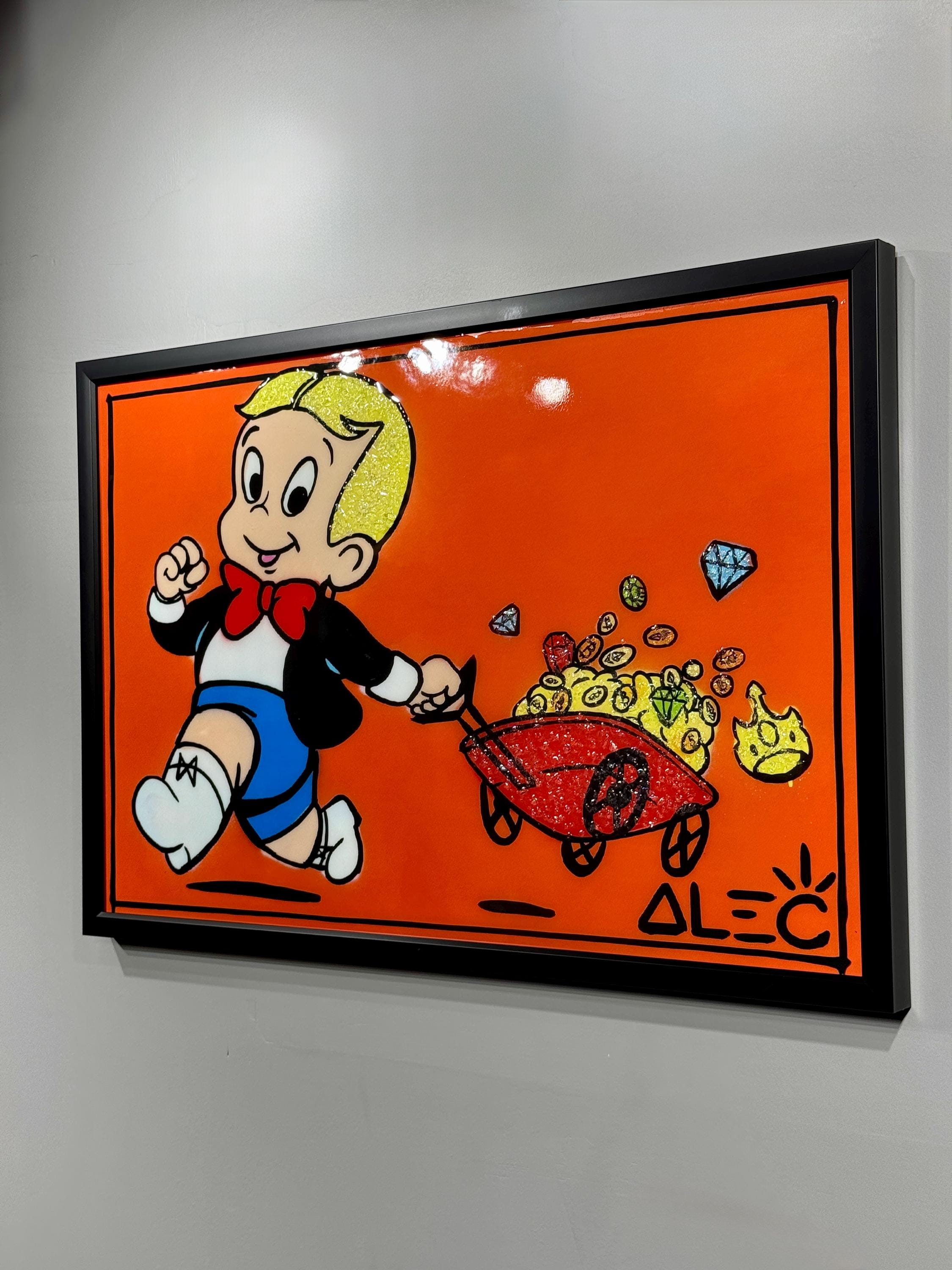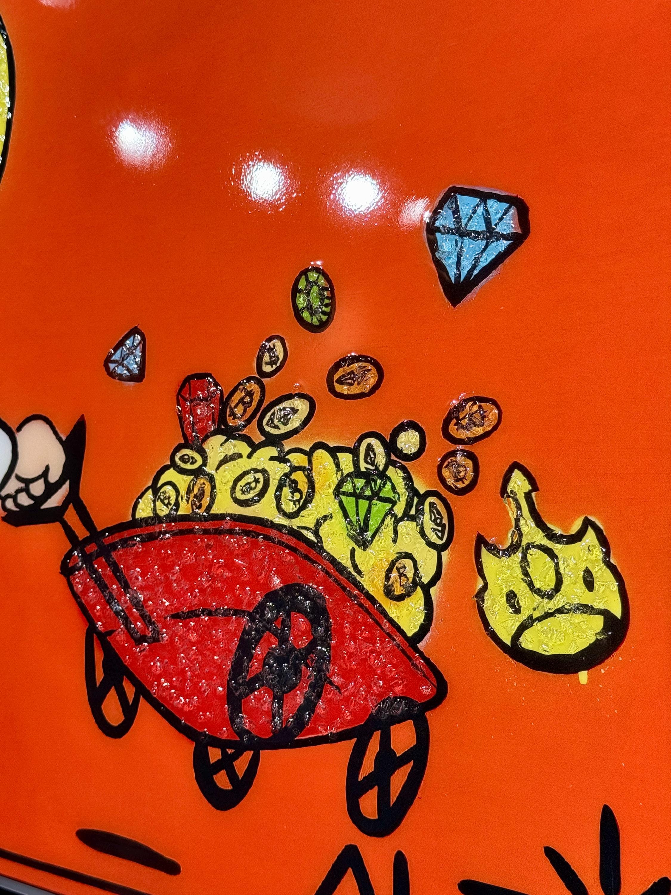 The cheerful character drawn on a bright orange background radiates life energy as he pulls his car filled with diamonds and gold.